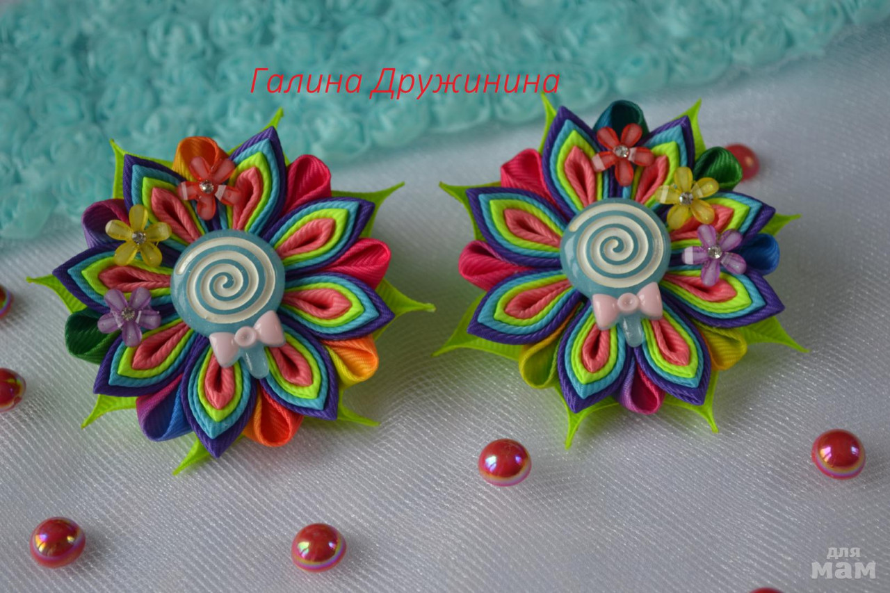 10) Бантики малыши. с пушистиками. Полностью из репса + органза. 7 см. диаметр