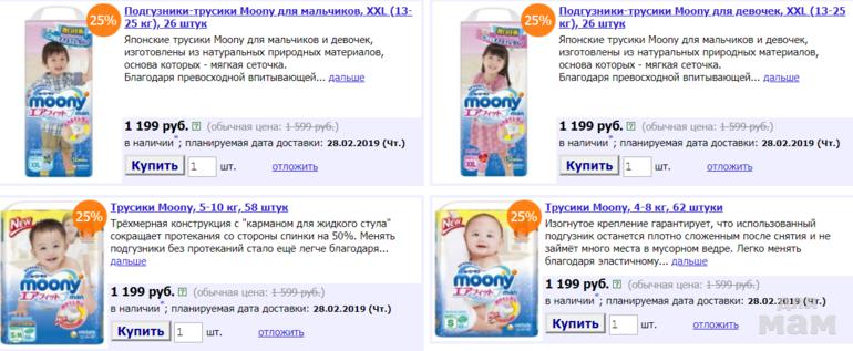 Скидки до 25% на подгузники и трусики Moonyдо 13.03.2019 23:00Подгузники и трусики Moony, представленные на этой странице со скидками до 25%, — это надёжная и бережная защита для самых любимых попок!