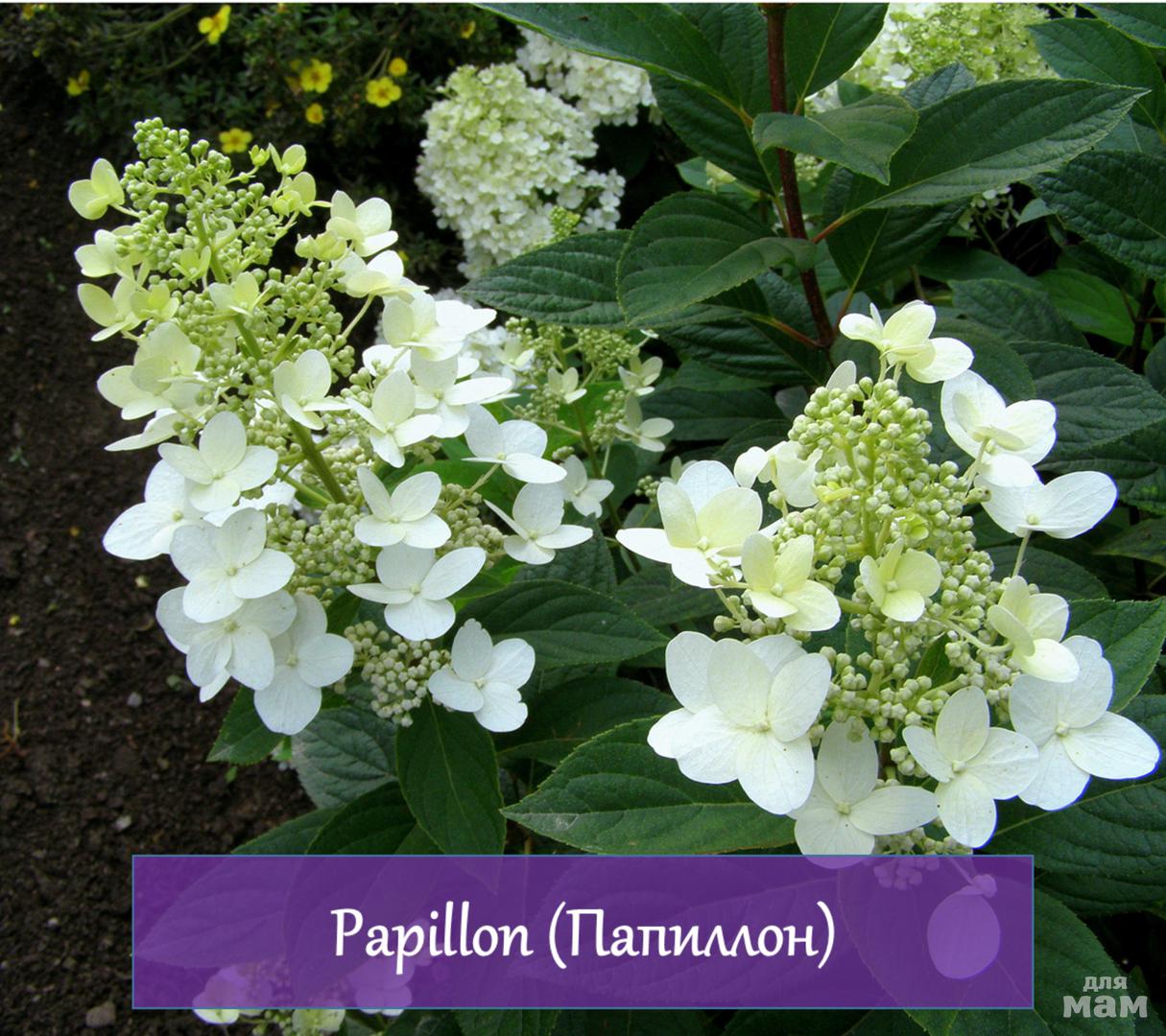 "Папиллон" Широкораскидистый куст высотой 1,5–1,7 м с асимметричной кроной. Относится к сортам поздних сроков цветения: в средней полосе зацветает в VІІІ и цветёт до начала Х. Один из немногих сортов, который не меняет окраску: весь период цветения соцветия остаются белыми. Соцветие состоит из цветков обоих типов. Стерильных немного, но они крупные, оригинальной формы, с 4 широко расставленными чашелистиками, дающими эффект пропеллера или порхающих бабочек.