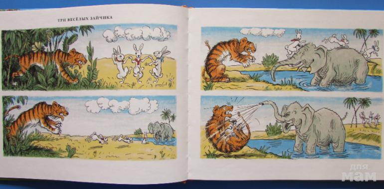 На каждой странице/развороте книжки размещена небольшая история в картинках (2-3-4 рисунка).