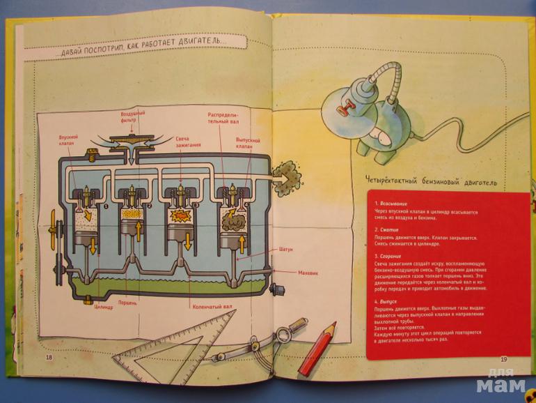 Вместе с ними и мы разберемся в том, как устроен автомобиль, узнаем как работает двигатель, для чего нужны карданный вал и рычаг переключения передач.