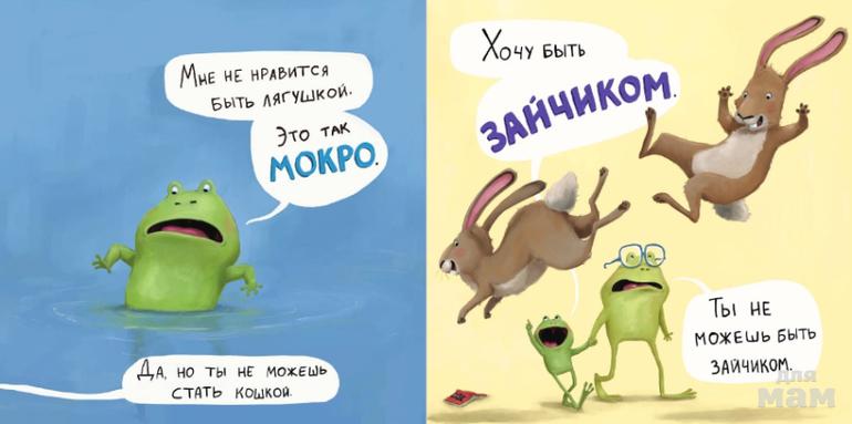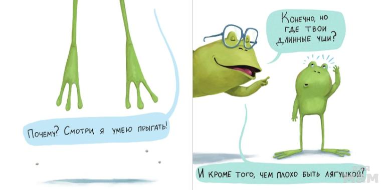 Лягушонок, который хочет быть каким-нибудь другим - пушистым, милым, тёплым - животным, начинает понимать, что быть тем, кто ты есть, очень даже хорошо.