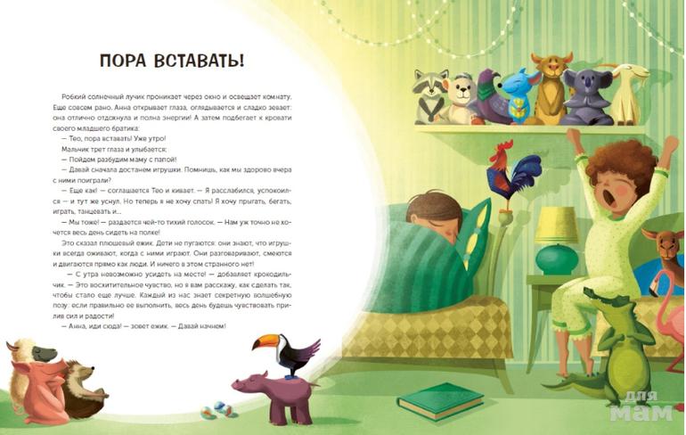 Книга рассчитана на детей, но заниматься утренней йогой могут и взрослые. Автор пишет, что йога для детей не ограничивается только игрой — у каждой позы есть своя польза и энергетические свойства, для проявления которых надо практиковать их в определенном порядке. Последовательность не случайна: каждая асана имеет свое значение. Ценность этой программы можно почувствовать, выполнив все упражнения по порядку.