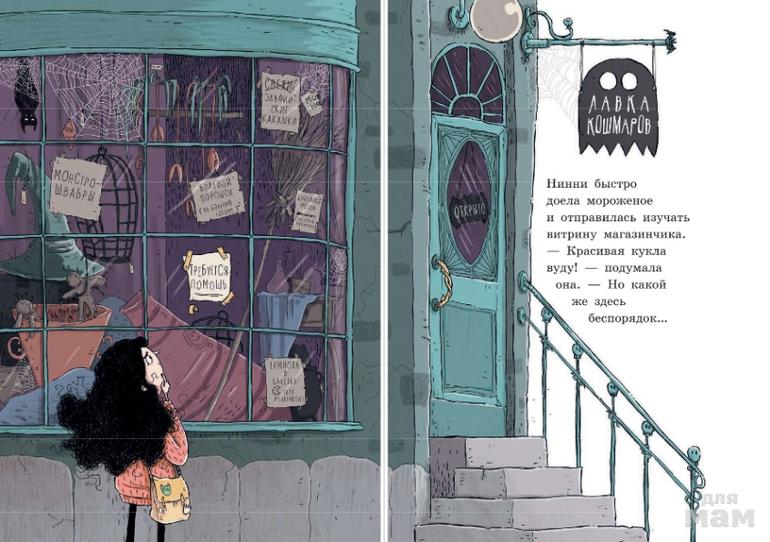 Нинни мечтает о велосипеде, но карманных денег хватает только на мороженое. Нужно подзаработать! Но кто возьмёт на работу девятилетнюю девочку? Разве что какой-нибудь чудак… Чтобы исполнить свою мечту, Нинни отправляется в "Лавку кошмаров" - магазинчик, торгующий монстрошвабрами, клетками для призраков и другими колдовскими штуковинами.