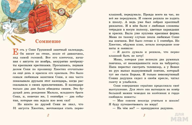 Вот и настал тот день, когда Соня Грушина по прозвищу Хвостик стала первоклашкой! Конечно, сначала ей было немного не по себе. Но как только она поняла, сколько забавных приключений её ждёт, сколько друзей она найдёт в школе, то от её опасений не осталось и следа! Во-первых, сама дорога до школы полна волшебства. Во-вторых, в школе учат не только читать, писать и считать, но и открывать в себе таланты.
