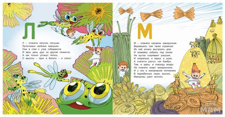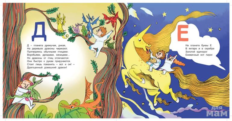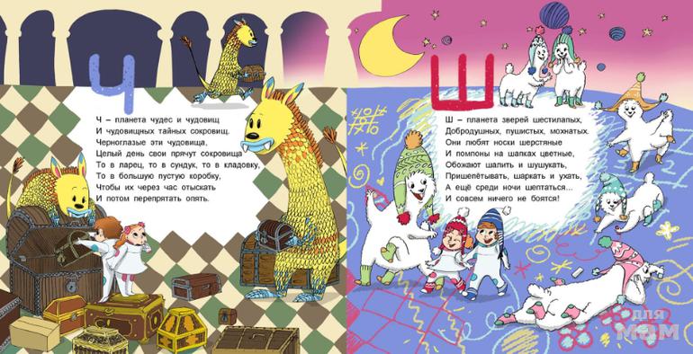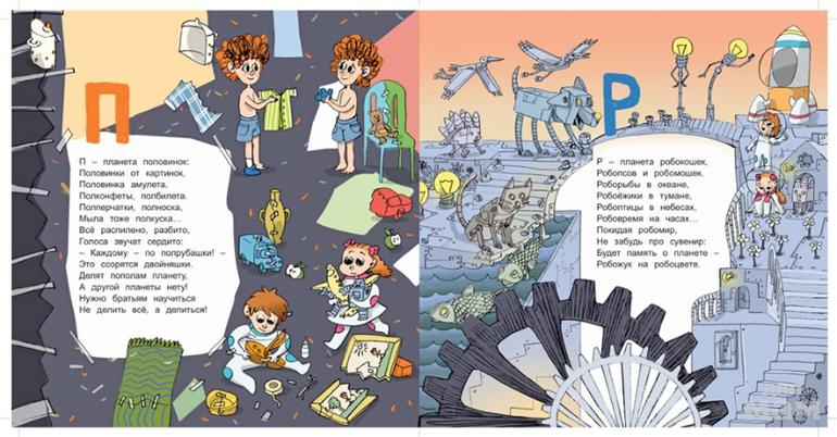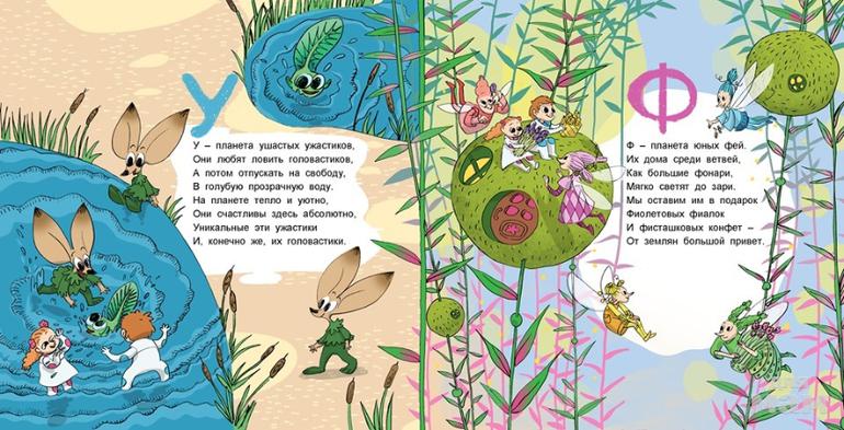 Это книжка-игра, которая приглашает в удивительное космическое путешествие по планетам-буквам. На каждой планете обитают необычные существа: полосатая арбузебра пасётся рядом с авокадрой, робкая белобока прячется среди ветвей, чудная грибоножка баюкает малыша, кривляка-забияка угощается зефиром, а дикие маленькие дракончики только и ждут, когда ты их приручишь. Переворачивая страницы, перелетая с планеты на планету, читая стихи и рассматривая забавные иллюстрации Анны Кузиной, ты не только познакомишься с буквами русского алфавита, но и научишься придумывать новые слова, новые планеты и целые миры.
