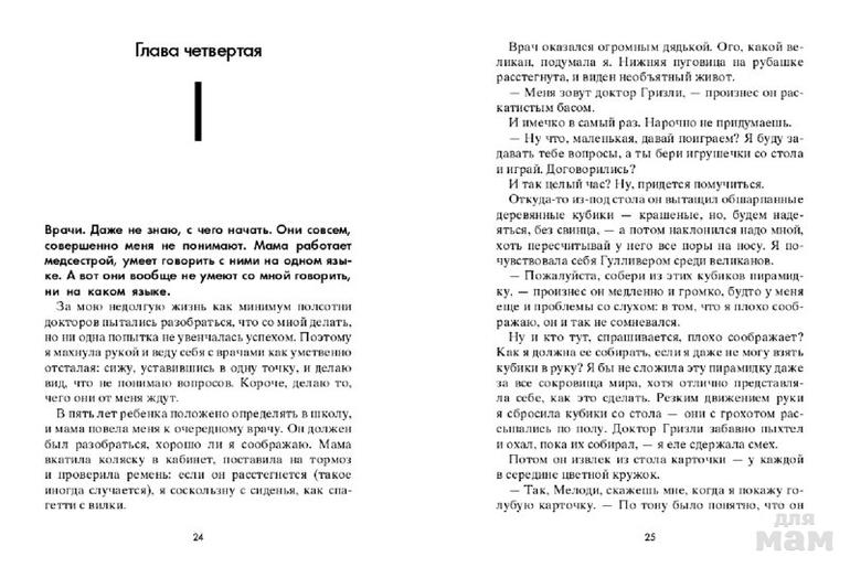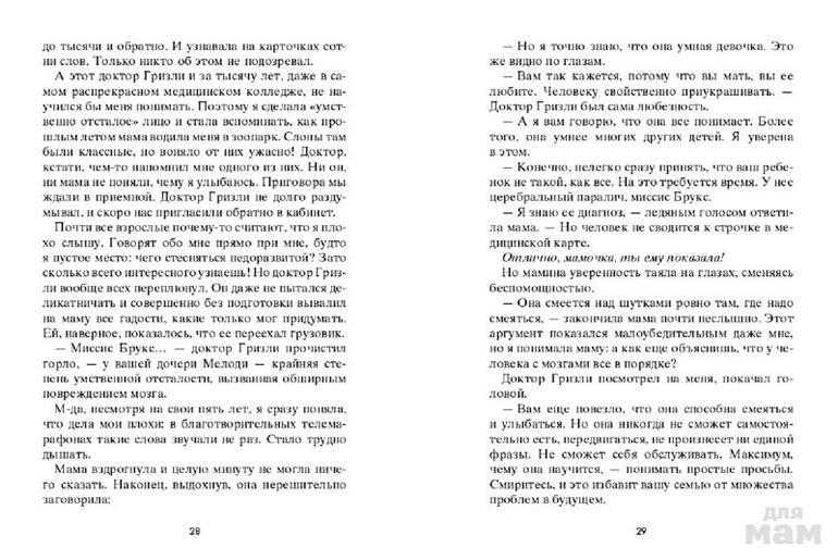 Мелоди не похожа на большинство людей. Она не говорит и не ходит, и многие считают ее “отсталой”. Но у нее необыкновенная память: она помнит все, что когда-либо с ней случилось. Мелоди умнее взрослых, которые пытаются поставить ей диагноз, и умнее своих однокашников из интеграционного класса, она видит, чувствует и слышит то, что другие не замечают. Она радуется жизни, но только представьте, как тяжело ей приходится, и как бывает грустно и невыносимо. Мелоди хочет, чтобы к ней относились как к человеку, а не диагнозу — ребенку с ДЦП. И она намерена доказать всем, что тоже чего-то стоит...