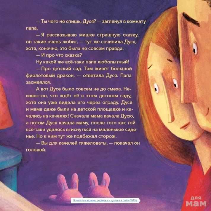 Совсем скоро Дуся впервые пойдёт в детский сад. Девочка очень волнуется. Что же её там ждёт? Подружится ли она с кем-нибудь? А вдруг в детском саду живёт большой фиолетовый дракон?