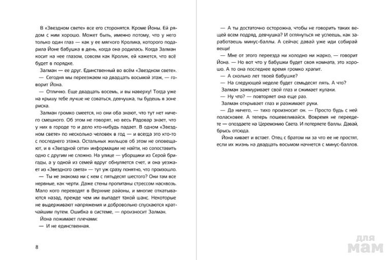 Родители четырнадцатилетней Йоны Бергер усердно трудятся на фабрике корпорации "КомВью". От детей требуется совсем немного: получать хорошие оценки и быть полезными соседям. Тогда количество баллов на семейном счете будет исправно расти, и можно будет переехать на несколько этажей выше. А если повезет, перебраться в Верхние районы, где, по слухам, разрешено свободно выходить на улицу… Ради этого стоит, пожалуй, поступиться правом заводить домашних питомцев и комнатные растения. И смириться с тем, что бабушку заберут в дом "плюс" - возможно, ей и правда будет там лучше. Или нет? Желая спасти бабушку, Йона начинает задавать неудобные вопросы и протестовать против установленных правил. Знакомство с Килианом и "Сворой" меняет ее жизнь.