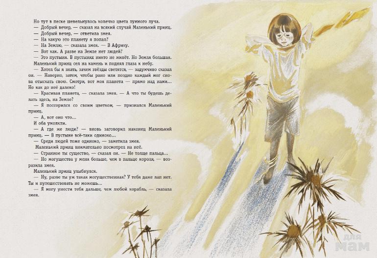 Одним из первых художников, который создал иллюстрации к Маленькому принцу, отличные от рисунков самого автора, была великолепная Ника Гольц. Ее светлый и трогательный Маленький принц словно рождается из путешествия под звездами и гармонично соседствует с рисунками самого Сент-Экса, вызывая у читателей бесконечную эмпатию. В этом образе - маленького земного мальчика - она разглядела космические черты, так созвучные ее собственному представлению о герое Экзюпери
