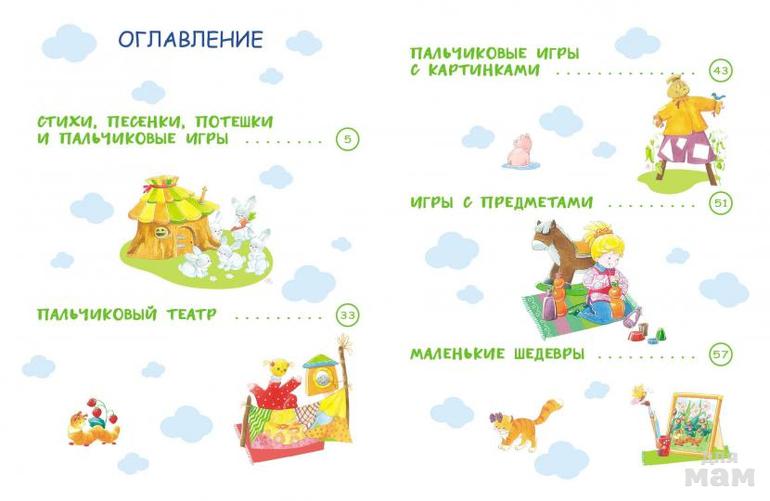 Третий раздел посвящён пальчиковым играм с использованием картинок. Четвёртый раздел посвящён играм с использованием различных предметов. Пятый раздел поможет вам организовать мастерскую маленького художника.