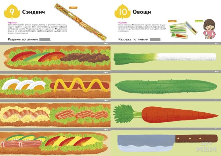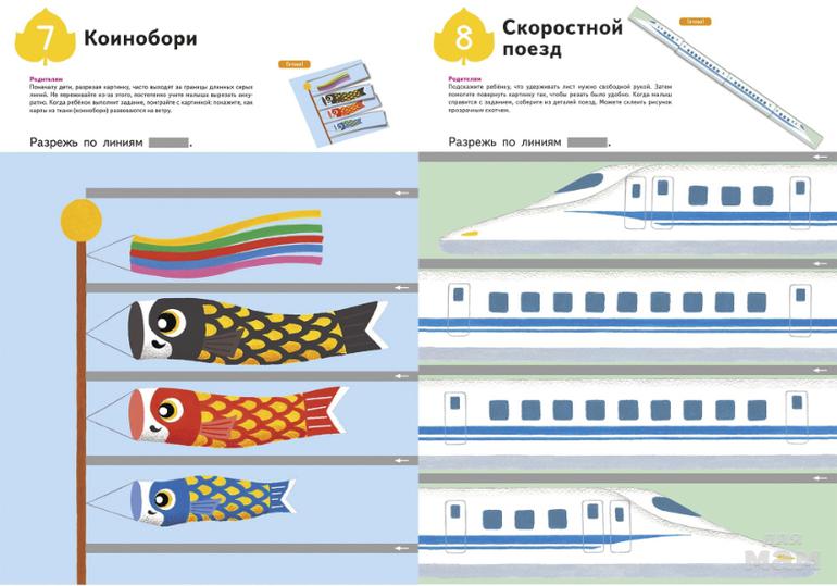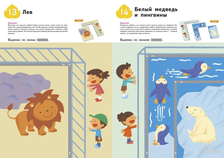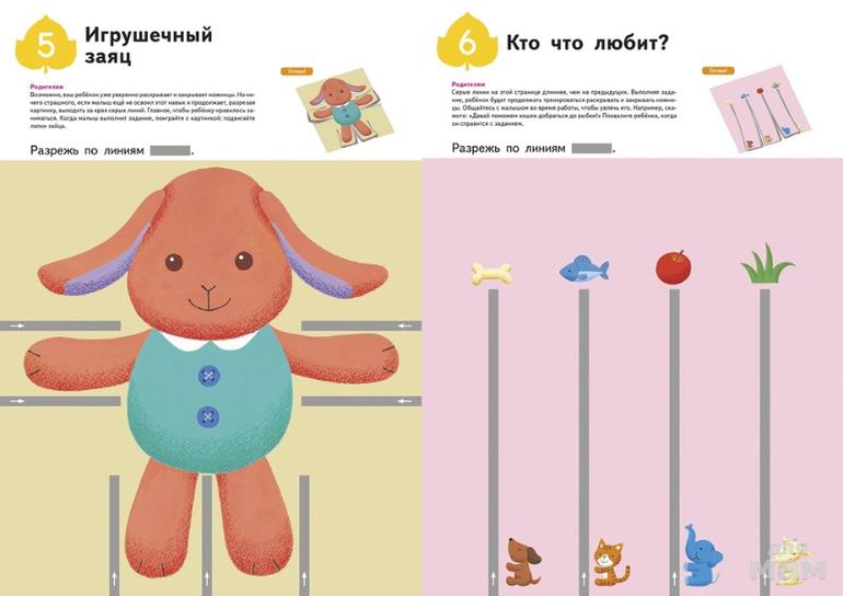 Сначала малыш будет вырезать различные картинки, а затем делать из них поделки, складывая бумагу по линиям. Сложность упражнений растет постепенно: от прямых линий ребенок будет переходить к ломаным, к дугам и сложным фигурам, совмещающим в себе разные виды линий. С поделками потом можно будет еще и играть.