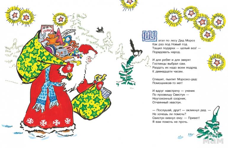 Сколько хлопот под Новый год у доброго волшебника Деда Мороза! Ведь гостинцев на праздник ждут все: и ребята в домах, и зверята в лесу. А тут навстречу запыхавшемуся Деду Морозу — мальчуган по прозвищу Свистун. Взялся мальчишка помочь разнести подарки, да вот беда: все премудрости букваря просвистели мимо его бедовой головы. Как же разобраться, кому какой подарок предназначен? Так и начались в зимнем лесу настоящие новогодние происшествия…