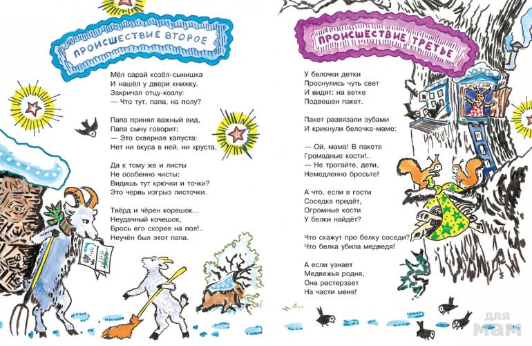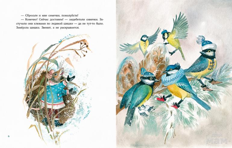 Зимняя сказка Ирины Яковлевой "Лесная столовая" - добрая история о взаимовыручке и находчивости. Автор окончила биологический факультет МГУ им. Ломоносова и с 1967 года писала сценарии для передачи "Спокойной ночи, малыши". Поэтому герои книги - шустрые синички, красавец Глухарь, добрый Дятел и соня-Бурундук - получились по-научному убедительными, и при этом милыми и сказочными.