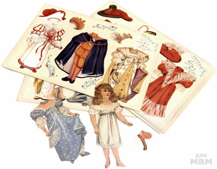 – сами бумажные куклы: 6 викторианских кукол из плотного картона и целый ворох нарядов: повседневные и праздничные викторианские костюмы, великолепные наряды принцев и принцесс, карнавальные костюмы по сказкам Шарля Перро – все что нужно настоящей моднице.