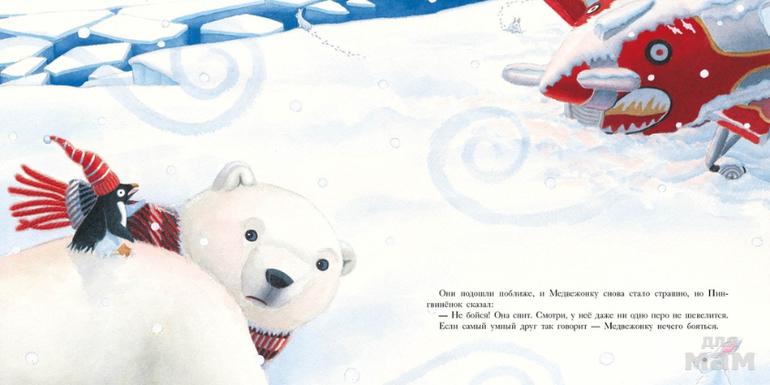 Однажды перепуганный Пингвинёнок прибежал к Медвежонку рассказать об огромной красно-белой птице, приземлившейся на льду. Он никогда в жизни такой не встречал! Друзья решают подойти поближе к птице, чтобы рассмотреть её как следует, и ещё не подозревают, какое удивительное открытие их ждёт…