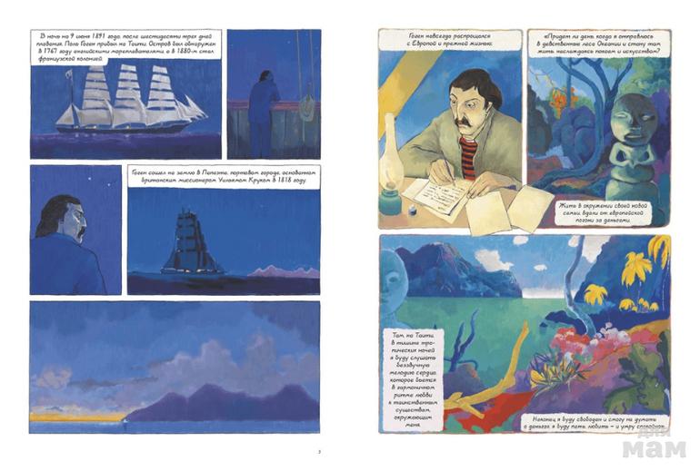 Словно кадры киноленты, перед нами проходят воспоминания художника. Пасмурный Париж, заснеженная Бретань, ослепительно яркий Таити — память окрашивает каждый период в свой цвет. Дори использует палитру самого Гогена, и благодаря этому кажется, что мы смотрим его глазами.