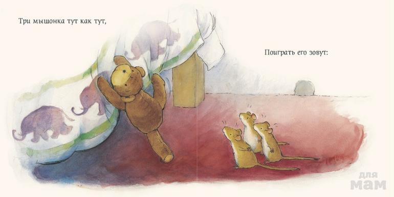 Выпал мишка из постели» — книга для самых маленьких читателей о приключениях плюшевого мишки, который ночью выпал из постели малыша и не знал, как вернуться обратно. Вместе с тремя мышками он отправляется в захватывающее путешествие. Их ждут гонки, кукольное чаепитие, осада крепости троллей, лягушачий концерт... Все это очень интересно, но вернется ли мишка в свою постель?