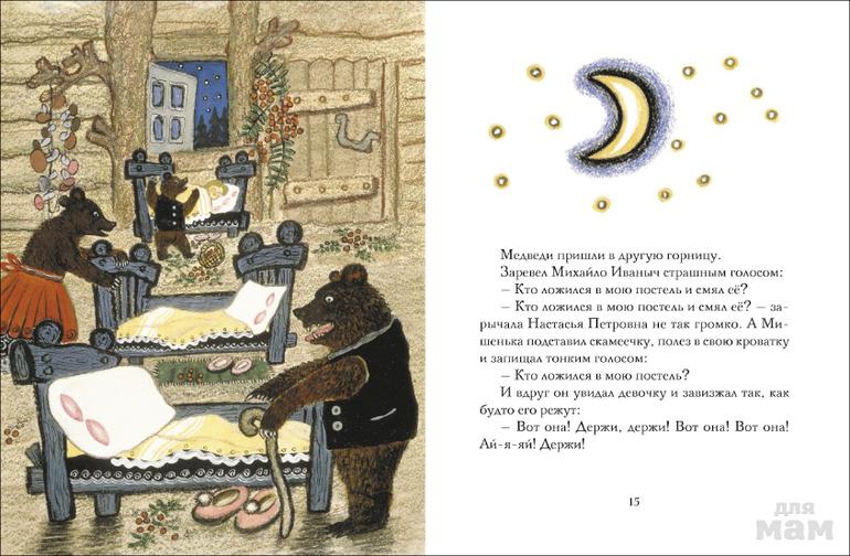 Чудесные иллюстрации Юрия Васнецова – крупные, но с привлекательными деталями: вот Мишутка, чтобы не потеряться в лесу, ухватился за завязки передника Настасьи Петровны; вот Маша лихо раскачалась на Мишенькином стульчике, а из лукошка выпадают грибы. Миски расписные, ложки резные, у каждой кровати по половичку и даже тапочки с помпонами. И гроздья рябины со связками грибов развешаны по медвежьему дому – видимо запасы к холодам.