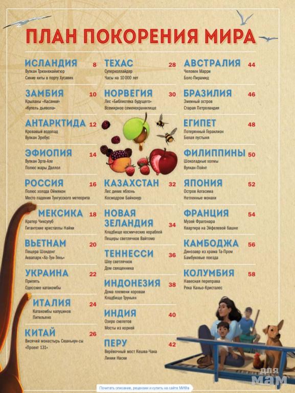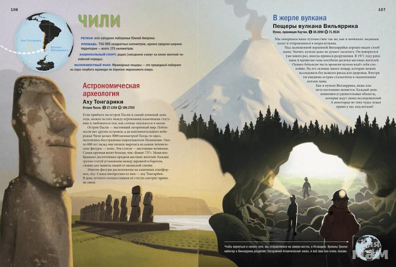Книга знакомит ребёнка с малоизвестными и при этом удивительными чудесами планеты: природными и рукотворными. Всего в книге описываются 100 мест и 46 стран мира. Каждый разворот посвящён определенной стране или территории (например, Шотландии, штату Техас, Микронезии, Антарктиде). Следующий разворот начинается с похожего места, но на другом краю света. Читаем про пещеры светлячков Вайтомо в Новой Зеландии, а затем — про шоу светлячков в национальном парке «Грейт-Смоки-Маунтинс» в штате Теннеси (США).