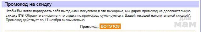 ВОТЭТО8 - по 17 ноября 2019 промокод скидка 8 % на всё.