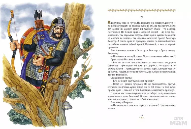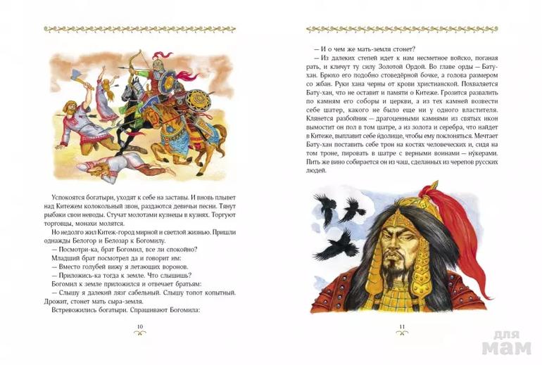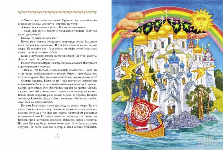 Как только встало солнце, подошла орда к Китежу. И замерли ханские воины. Будто зачарованные остановились их кони. Никогда еще не видели ордынцы подобного города. Не встречалось им таких красот ни в одной земле! Словно сказка сверкает Китеж на краю светлого озера. Золотятся церковные купола. Серебрятся крыши изб, теремов и палат. И впрямь: нет у города крепостных стен, нет каменных башен…