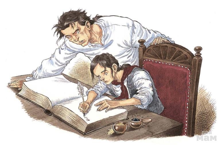 Заглянем, например, в школы разных эпох. В египетской школе писцов учатся только мальчики, а в римской школе — мальчики и девочки вместе. В египетской школе пишут на плоских каменных пластинках тростниковыми палочками с краской. В римской — палочками-стилусами на покрытых воском дощечках. В средневековой Англии — перьями на листах пергамента. А юнгам на корабле важнее знать названия парусов, чем алфавит…