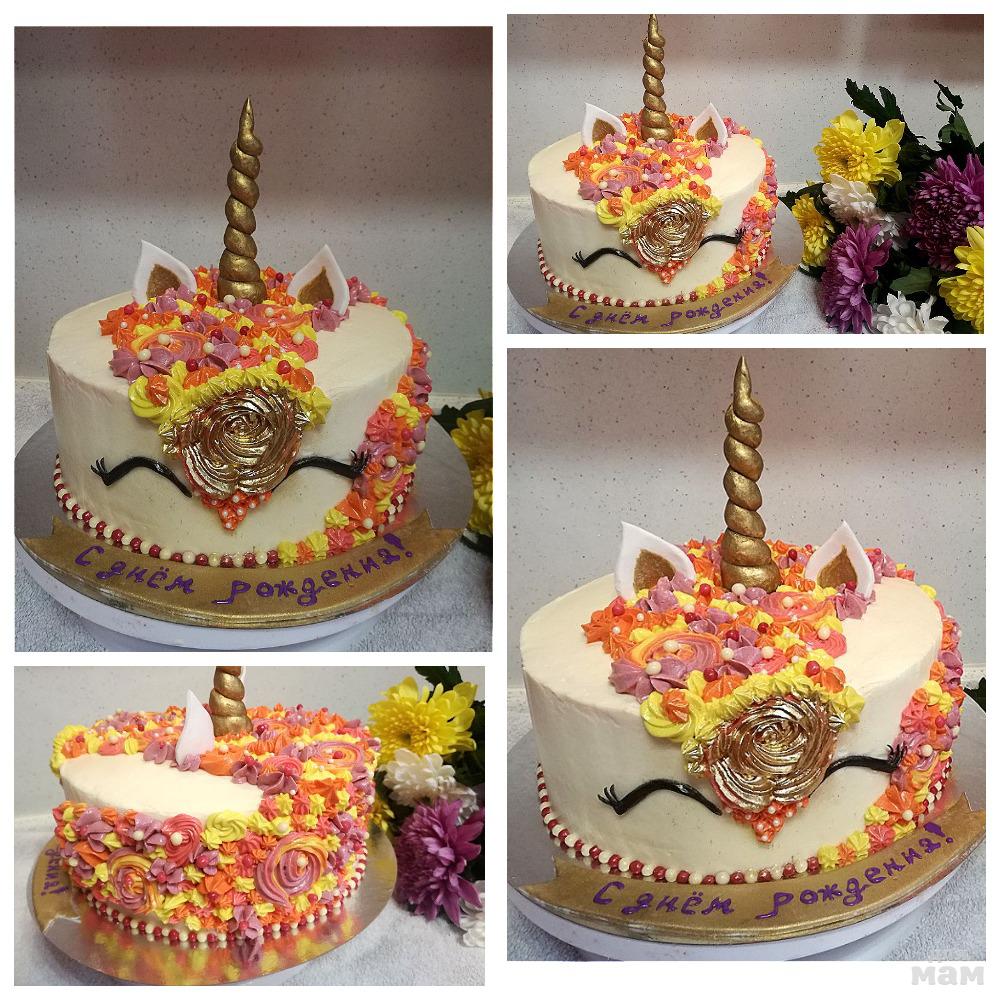 Торт радужный единорог, начинка радужные коржи и крем чиз.
