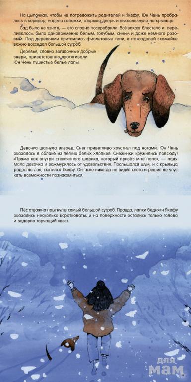 Юн Чень и её верный друг, такса по имени Якефу, очень хотели увидеть, как падают с неба белые снежные хлопья! Это зимняя сказка о большой мечте маленькой девочки. Но иногда исполнить своё заветное желание непросто. Главное, никогда не переставать верить в чудеса, и тогда ваши мечты обязательно сбудутся!