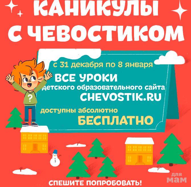 Все каникулы, с 31 декабря по 8 января, сайт chevostik.ru будет открыт абсолютно бесплатно!