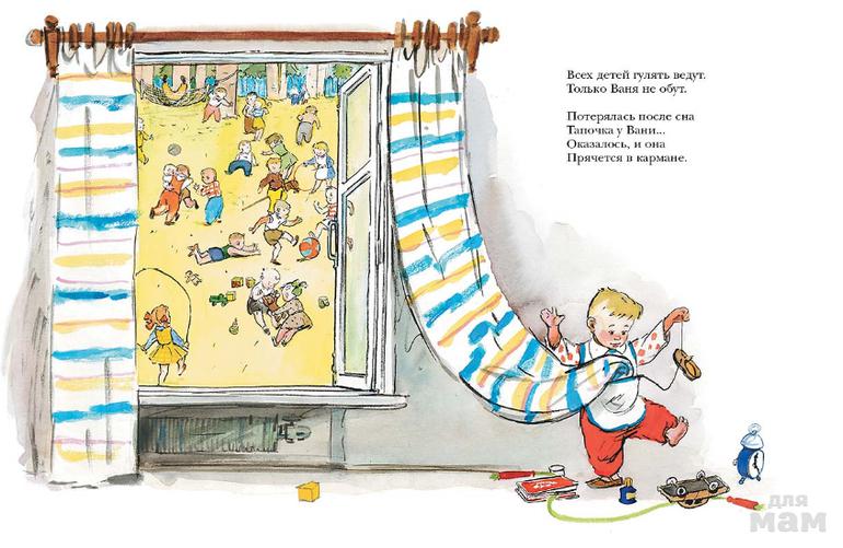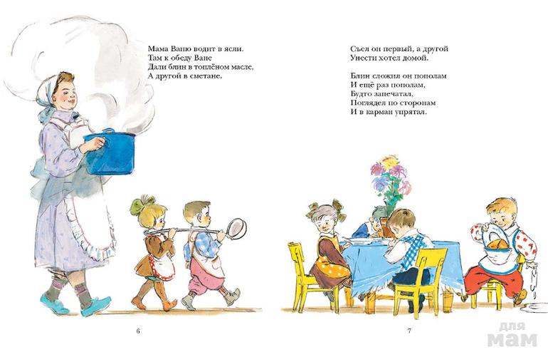 Художники Анатолий Елисеев и Михаил Скобелев нарисовали выразительные иллюстрации со смешными подробностями. Малыши будут с удовольствием рассматривать хозяйственного Ваню с необъятным карманом, в котором странным образом уместились и рогатая корова, и жираф, и юла, и пирамидка, и множество других заманчивых предметов. Хороша для рассматривания и жизнь детского сада: повариха с кастрюлей, детки в фартучках с поварёшкой, прогулка на детской площадке, коллективный поиск исчезнувшего барабана и т.д.