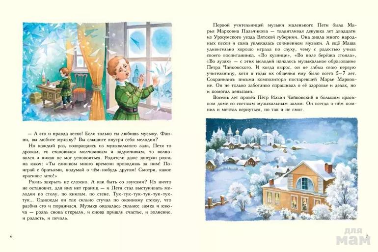 В книге много диалогов, именно они помогают глубже погрузиться в ощущения и переживания сначала юного, потом зрелого композитора, познакомится с людьми, которые его окружали, которых он любил. Книга будет особенно близка ребенку еще потому, что в ней много интересных фактов из раннего детства Петра Ильича. Например, его сильнейшие переживания, когда он увидел мертвого шмеля или как разбил стекло, выстукивая на нем ритм, потому что родители закрыли рояль на ключ.