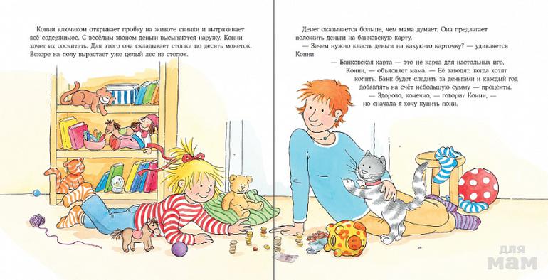 На примере Конни разберите с малышом, какие у нас в России есть деньги, что такое банковские карты и как с их помощью можно откладывать деньги на новые игрушки.