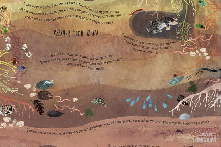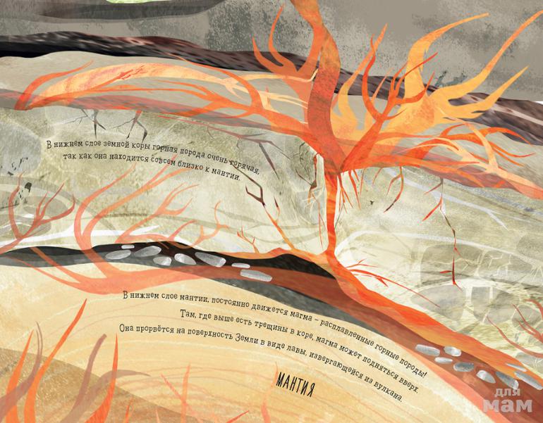 Плотные страницы книги на ваших глазах развернутся в огромные иллюстрации длиной 2,5 метра! На этих иллюстрациях вы и ваш ребёнок сможете увидеть, как устроена наша планета: всё, что скрыто в её глубине, от тонкого слоя плодородной почвы до раскалённого внутреннего ядра.