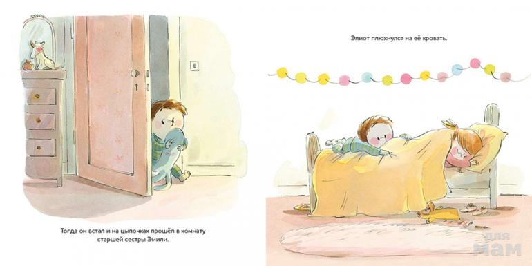 Однажды Элиоту приснился кошмар. Снова заснуть он не смог и пошёл в комнату старшей сестры, где плюхнулся на её кровать. Эмили при этом проснулась и отправилась в спальню к родителям, которые теперь тоже не спят, а папе придётся устраиваться спать на полу в коридоре. Смешная история о том, как в большой семье всем хочется спать.