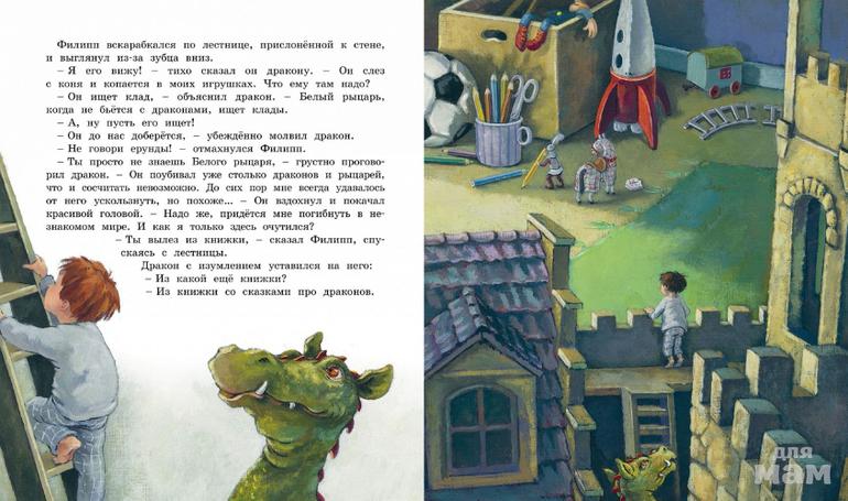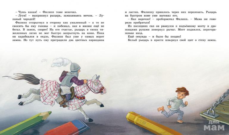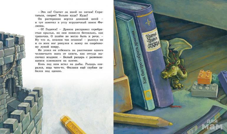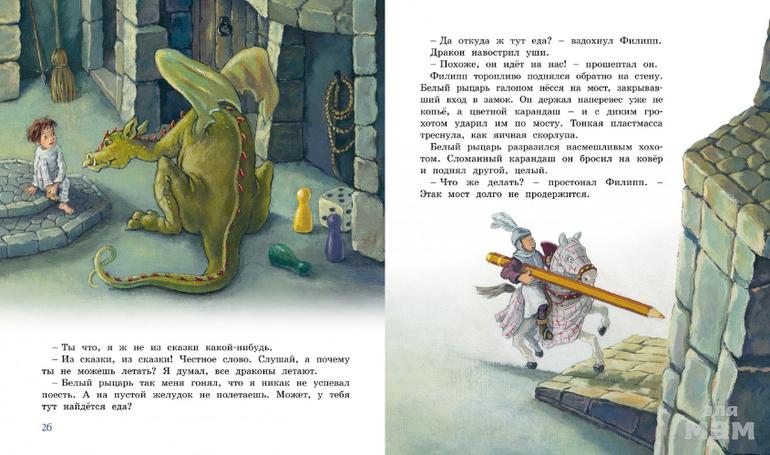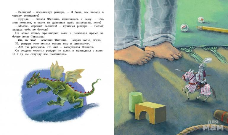 А вот с Филиппом такая история случилась однажды волшебной лунной ночью. Из книги у его кровати вдруг выскочил маленький дракон, преследуемый свирепым всадником. Пытаясь помочь бедняжке-дракону, который пытался укрыться в игрушечном замке, мальчик вдруг сам превратился в кроху. Злой рыцарь, закованный в латы, оказался намного больше его. Чтобы спасти дракона и спастись самому, Филиппу пришлось призвать на помощь смекалку.