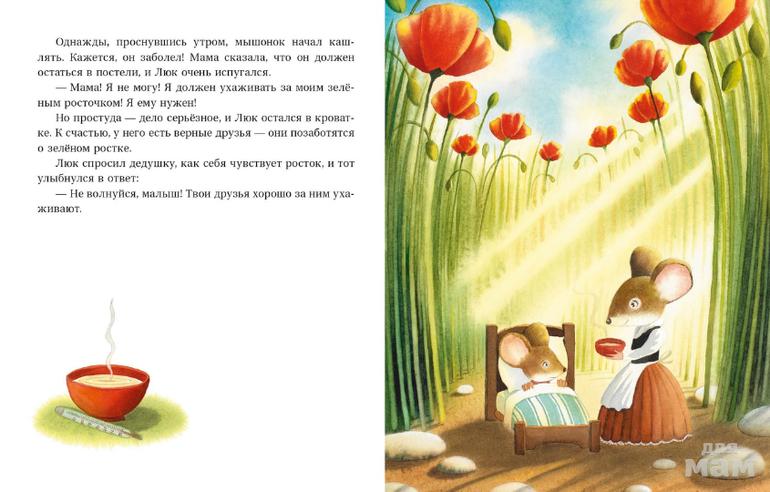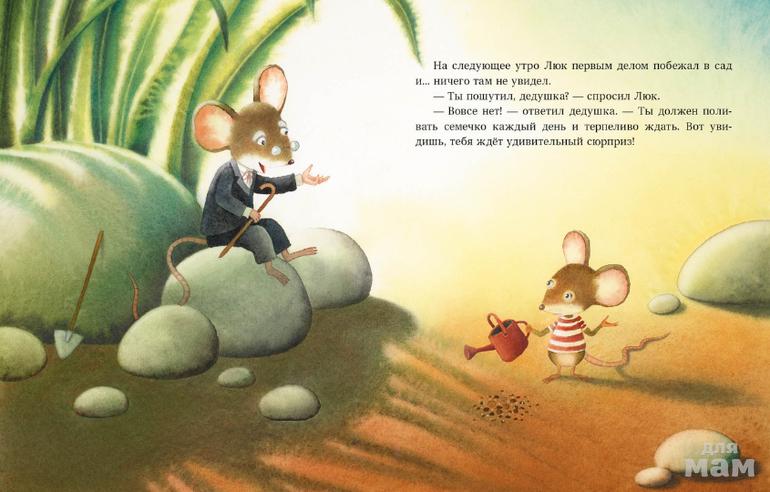 Мышонок Люк получил на день рождения необычный подарок. Дедушка подарил ему мешочек семян. Люку пришлось набраться терпения и научиться ухаживать за маленьким росточком. Его труды оказались вознаграждены!
