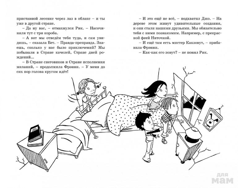 Приехав в гости к Джо, Бет и Фрэнни, Рик думает, что умрёт от скуки в деревенской глуши, но как бы не так! Оказывается, в соседнем лесу растёт волшебное дерево, заселённое чудесными существами. А если подняться на облако, к которому приставлена лесенка, то попадёшь в страну Сварливию или Вверхтормашию или Страну угощений, где все дома построены из сладкого! Страны прилетают и улетают, как самолёты по расписанию, превращая каникулы в настоящую сказку!