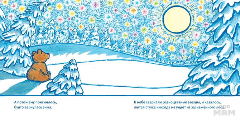 Наступает зима, Большой медведь засыпает и видит цветные сны, в которых вновь становится маленьким медвежонком.