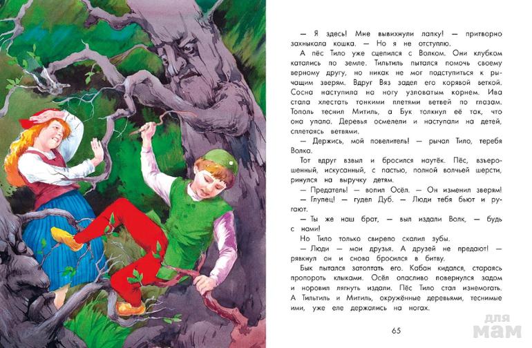 Главные герои этой книги - Тильтиль и Митиль, дети бедного дровосека. В Рождественскую ночь к ним является старушка и просит отправиться на поиски Синей птицы. Внучка старушки больна - и только чудесная птица, приносящая счастье, может вернуть ей здоровье. Тильтиль и Митиль соглашаются, и тогда старушка вдруг превращается в фею, все предметы оживают, а домашние питомцы обретают дар речи. Дети вместе с верным псом Тило и хитрой кошкой Тилеттой, а также ожившими Хлебом, Сахаром, Водой и Огнем отправляются в удивительное путешествие. Им потребуются вся храбрость, ловкость и смекалка, но главное - доброт