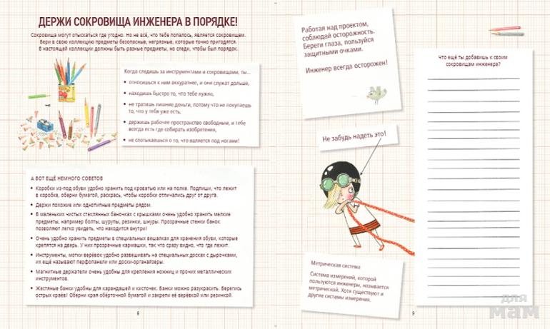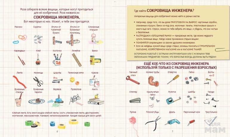 С этой (большой!) книгой проектов и вместе с Розой Риверой (которая очень хочет стать инженером!) надо придумывать решение проблем (серьезных и смешных), устраивать мозговой штурм и набрасывать идею за идеей, рисовать свои изобретения, строить (простые и сложные) механизмы и сооружения и не бояться ошибок!