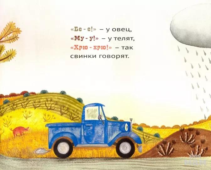 Напоминающие фольклорные мотивы строки стихотворения знакомят читателей с Голубым грузовичком и обитателями скотного двора, которых он встречает, пока едет по проселочным дорогам мимо своего сельского дома. Первая половина книги - очаровательная, приводящая в оцепенение симфония сигналов машины и звуков животных. Веселый текст имитирует прыгающий грузовик, а теплые иллюстрации в народном стиле дополняют картину. Начинается дождь, и в историю вступает подлый, напыщенный самосвал. Когда же самосвал попал в грязь и сигналит о помощи, никто его не слышит. Голубой грузовичок хочет помочь, но тоже застревает. И когда он кричит о помощи, животные бегут ему на выручку. Так самосвал узнает, что:
