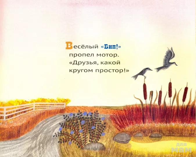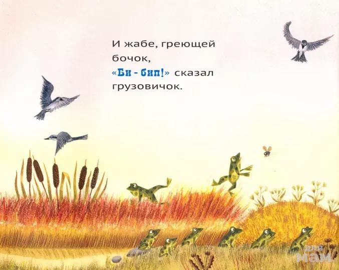 Напоминающие фольклорные мотивы строки стихотворения знакомят читателей с Голубым грузовичком и обитателями скотного двора, которых он встречает, пока едет по проселочным дорогам мимо своего сельского дома. Первая половина книги - очаровательная, приводящая в оцепенение симфония сигналов машины и звуков животных. Веселый текст имитирует прыгающий грузовик, а теплые иллюстрации в народном стиле дополняют картину. Начинается дождь, и в историю вступает подлый, напыщенный самосвал. Когда же самосвал попал в грязь и сигналит о помощи, никто его не слышит. Голубой грузовичок хочет помочь, но тоже застревает. И когда он кричит о помощи, животные бегут ему на выручку. Так самосвал узнает, что: