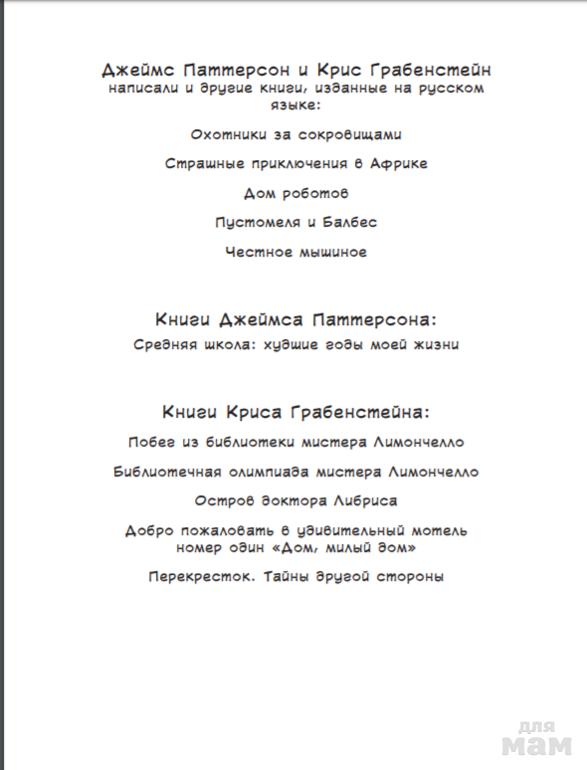 Джеймс Паттерсон получил Литературную награду за выдающуюся службу, вручаемую Американским литературным обществом Национального книжного фонда. Паттерсон вошел в Книгу рекордов Гиннеса как автор наибольшего количества бестселлеров в списках "Нью-Йорк таймс". Он неутомимый пропагандист книг и подросткового чтения и оказывают значительную финансовую помощь студентам педагогических вузов, магазинам, школьным библиотекам.
