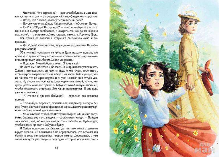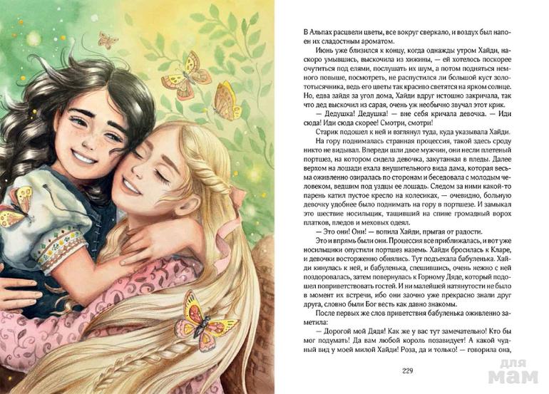 Хайди - открытая душа. Она готова любить всё и всех: сурового Горного Деда, мальчишку Петера, коз, горы, одинокого доктора, старенькую бабушку, больную подружку... Единственное, что может ее опечалить и заставить погаснуть звезды в глазах - это несвобода. Комфортная клетка городской жизни не для нее. Хайди - светлое, веселое, чистое и очень деятельное создание, которое приносит радость в жизнь всех, с кем встречается. Так как же жилось маленькой девочке в огромных горах?