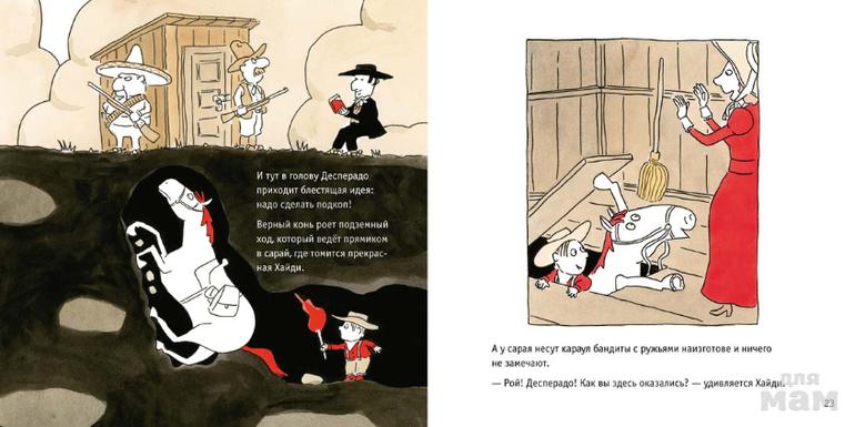 Немецкий художник Оле Кёнекке придумал и нарисовал вестерн. Сюжет этой истории построен по законам жанра: ковбой и его верный конь, похищение красавицы, погоня, плен, спасение, зло наказано, добро торжествует. Привычный сюжет? Возможно, но не для детской книжки-картинки. Где еще вы найдете ковбоя, который ходит в детский садик, обожает сок и печенье? А коня, который умеет идти по следу и делать подкоп?