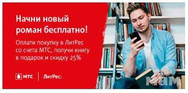 Акция ЛитРес — по 28 июля 2018 года оплачивая покупки на сайте ЛитРес с помощью счета мобильного телефона МТС, вы получаете уникальный промокод на подарок от «ЛитРес»: книга на выбор в подарок и скидка 25%.