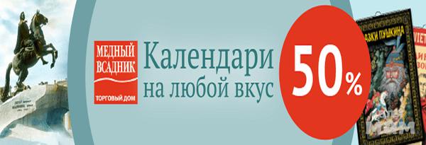 воспользуйтесь выгодным предложением на календари на 2019 год разнообразной тематики, разных форм и размеров от «Медного всадника», на которые действует скидка 50%!