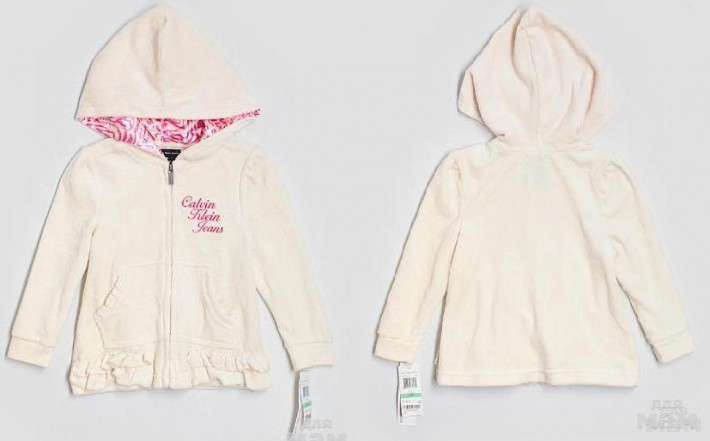 Велюровая толстовочка CALVIN KLEIN, на молнии. Кремового цвета, капюшон изнутри - на шелковой подкладке цвета розовый лео. Состав: 75% хлопок, 25% полиэстер. Размер 18 мес, но, на мой взгляд, немного большемерит.