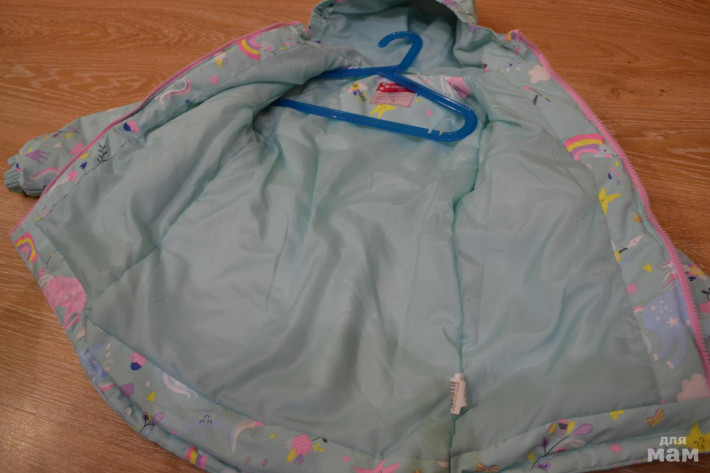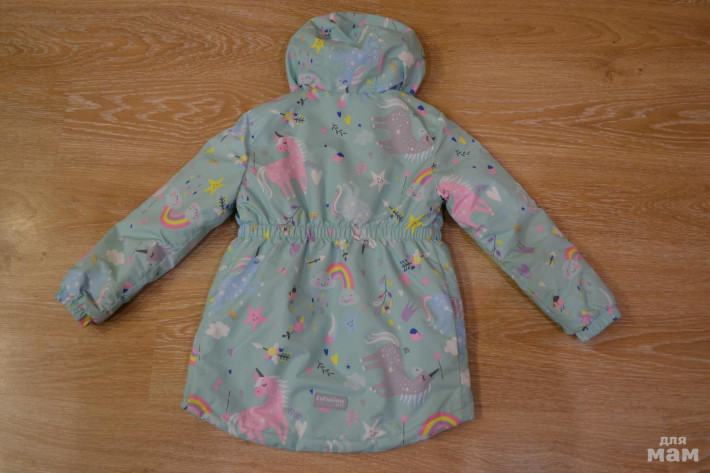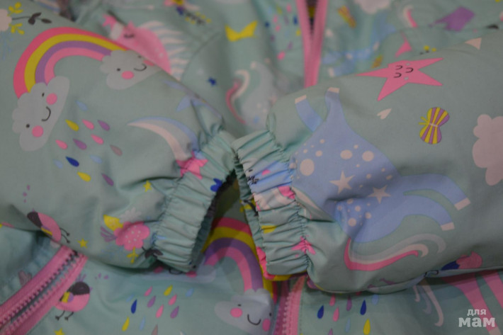 Удлиненная, утепленная куртка на прохладную осень/весну. Утеплителя прим. 60-80 грамм. Не промокает под дождём. Подкладка гладкий полиэстер, в капюшоне микрофлис. На талии резиночка, удобно, так как ветер не задувает в спину. Курточка удлиненная, фасон как у парки, попа полностью закрыта. Замечательный радостный принт с радугами, облачками и единорожками. Основной цвет курточки также очень приятный. На рукавах резиночка. не тугая. Курточку можно начинать носить при росте 116см. и до 122-124см.